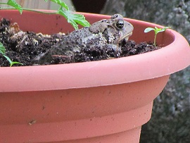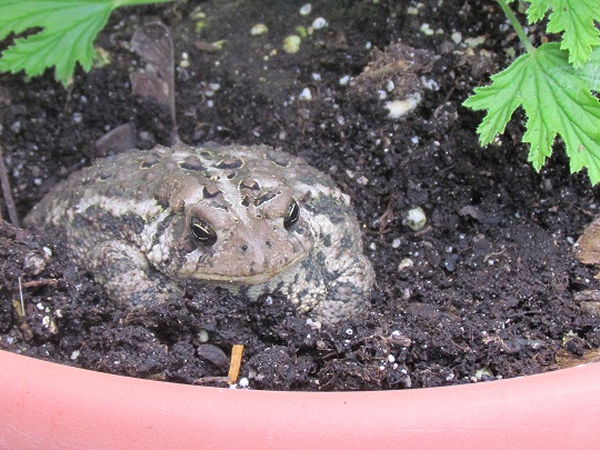 And I have a new little friend. This toad has decided to make one particular pot on the deck his home. He spends the day wandering around somewhere – and without fail, he’s back every night, hopping into his pot where he snuggles in for the night. I don’t know that he ever leaves the deck, I assume he does, but it would be interesting to see how he gets back up there.