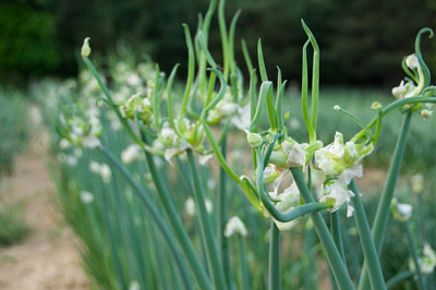 As the round, hollow onion stalks thicken and grow they can be snipped and eaten, similar to chives, but if left alone will develop small white flowers that by midsummer begin to fade as tiny, curled leaves and numerous small onions, or topsets, begin to grow at the stalk tip. New leaves will rise out of these topsets, which in turn produce further small onions, or bulbils at their tip (hence, the tree-like look of the tree onion name). As the weight of the onions overwhelm the stalk, it bows to the ground, and the young onions lay in the soil, root and form a new plant just inches away, almost as if stepping, or walking away from the mother plant. Gardeners can leave a few topsets on the plant each year to increase the overall onion yield as they randomly drop, or cut the onions from the stalk and plant in a preferred area. The Egyptian onion also forms numerous bulbils at ground level that can be removed without hurting the plant, providing more onions for the cook and more plants for the gardener.